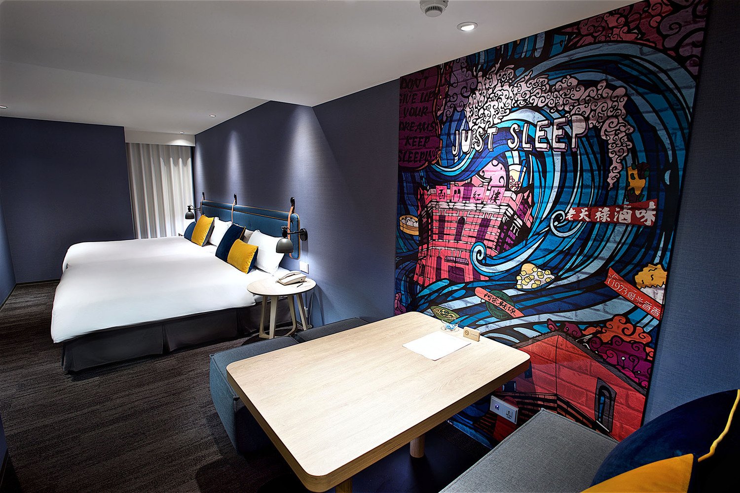有限空間的客房內,仍然保留旅宿的機能性,帶有收納功能的設計,實用且美觀。並備有多功能社交空間、網美系自拍天地、親子同樂空間等頗具特色的飯店設施。旅店帶有不拘自我的風格設計,加上許多俏皮的塗鴉裝飾,帶給旅人自由和放鬆的氛圍。 入住雙人房一晚含早餐平均價位在 1800 元上下,CP值超高!
